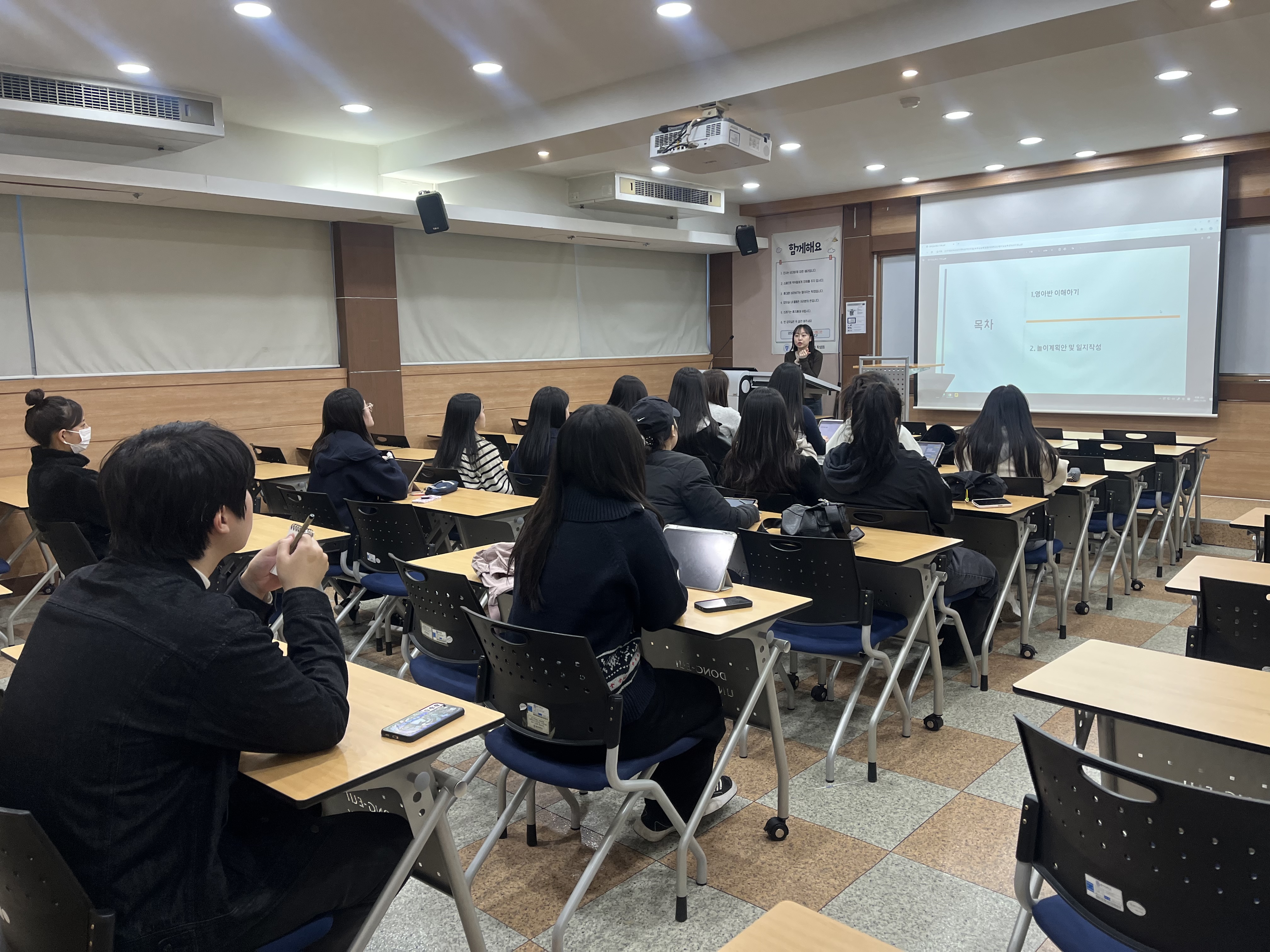 2025학년도 보육실습 준비 특강 1회차가 실습을 앞둔 3학년 학생들을 대상으로 진행되었습니다. 이번 특강은 예비 보육교사로서의 기본 소양을 함양하고, 보육실습 전 사전 준비사항 및 실습 수행 절차를 이해하도록 돕기 위해 마련되었습니다. 특강에서는 보육실습의 전반적인 운영 방식과 기관 선정 및 배정 과정, 실습일지 작성 요령, 실습생의 자세와 유의사항 등을 중심으로 안내하였으며, 실제 보육현장에서 필요한 기본 역량과 전문적 태도에 대해서도 함께 다루었습니다. 학생들은 특강을 통해 실습에 대한 구체적인 이해를 높이고, 보육현장에 나가기 전 필요한 준비사항을 점검할 수 있었습니다. 또한 실습 과정에서 발생할 수 있는 다양한 상황에 대한 대처 방법과 실무 예절 교육을 통해 현장 적응력을 강화하는 시간을 가졌습니다.